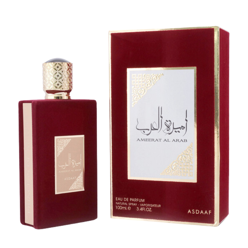Voel de koninklijke allure van Asdaaf Ameerat Al Arab Eau de Parfum 100 ml – een elegante oosterse geur die vrouwelijkheid, luxe en kracht perfect uitstraalt. De parfum opent met verleidelijke bloemige en fruitige noten, gevolgd door een rijk hart van roos, amber en jasmijn, en eindigt met een warme basis van vanille, musk en hout. Deze verfijnde compositie creëert een betoverende geur die elegantie en mystiek combineert.