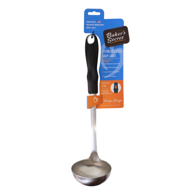De Baker’s Secret Roestvrijstalen Soeplepel is onmisbaar in elke keuken. Dankzij de diepe lepelkop schep je moeiteloos soep, saus of stoofgerechten op. De lange, stevige steel zorgt ervoor dat je handen op veilige afstand van de hitte blijven, terwijl het comfortabele antisliphandvat een stevige grip biedt. Gemaakt van hoogwaardig roestvrij staal en voorzien van een ophangoog voor eenvoudige opslag.