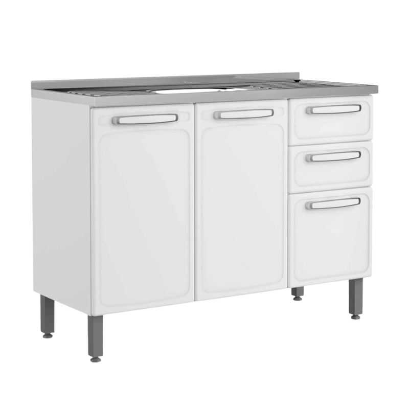 Deze moderne keukenkast met geïntegreerde wasbak is de oplossing voor compacte en stijlvolle keukeninrichting. Met een breedte van 120 cm, diepte van 48.3 cm en hoogte van 89.2 cm biedt hij optimale functionaliteit. De combinatie van drie witte deuren en twee witte lades zorgt voor een strak contrast en slimme opbergruimte. De witte handgrepen en zes stevige poten geven het geheel een elegante, stabiele uitstraling. Perfect voor wie design en gebruiksgemak wil combineren.