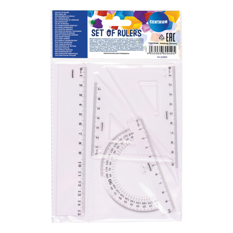 De centrum Geometrieset is een handige en compacte set meetinstrumenten, perfect voor school, studie of dagelijks tekenwerk. Deze set bevat een liniaal van 15 cm, twee Tekendriehoek ( 7 cm en 10 cm) cm en een gradenboog– alles wat je nodig hebt voor nauwkeurige metingen en tekeningen.