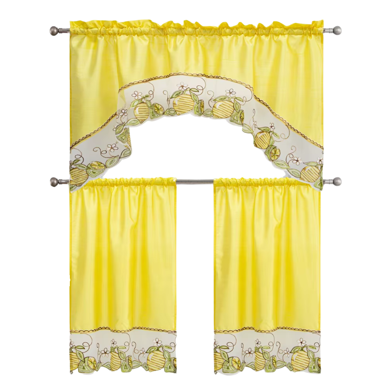 Breng direct een frisse, sfeer in je keuken met deze 3-delige keukengordijnset. De set bestaat uit twee paneelgordijnen en een bijpassend valletje, afgewerkt met een speelse print en subtiele borduursels. De lichtdoorlatende stof zorgt voor voldoende privacy zonder het natuurlijke daglicht te blokkeren. Dankzij de elastische roede-openingen zijn de gordijntjes eenvoudig op te hangen en passen ze vrijwel op elke standaard roede.