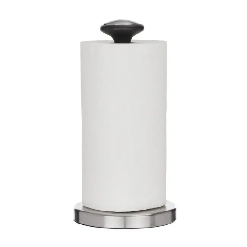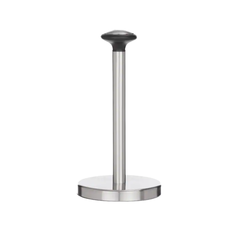Deze moderne keukenrolhouder van RVS is een praktische en stijlvolle toevoeging aan elke keuken. Dankzij het minimalistische ontwerp en de stevige ronde basis blijft de houder stabiel staan tijdens gebruik.