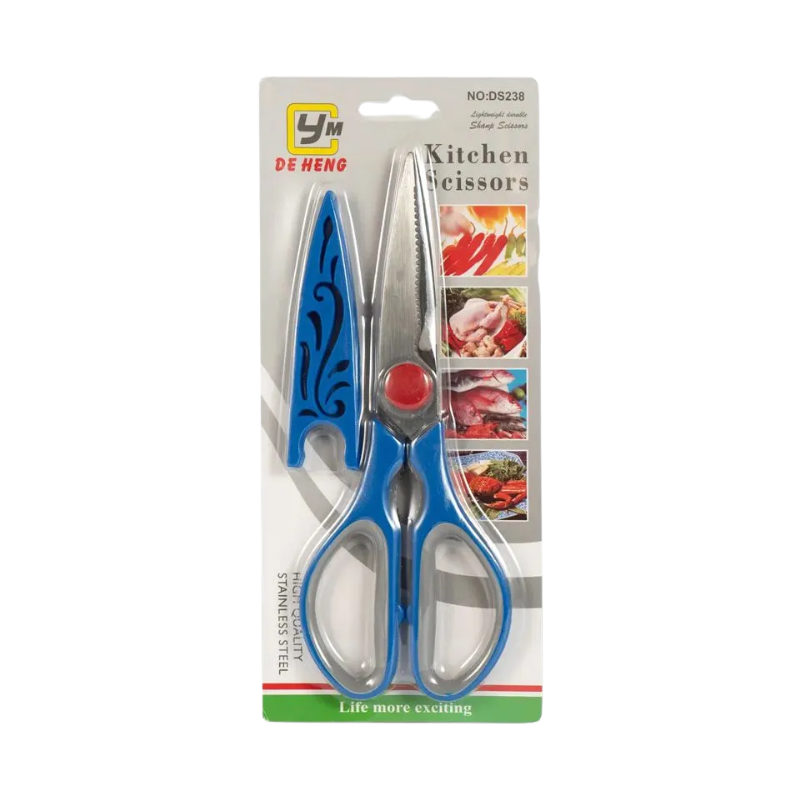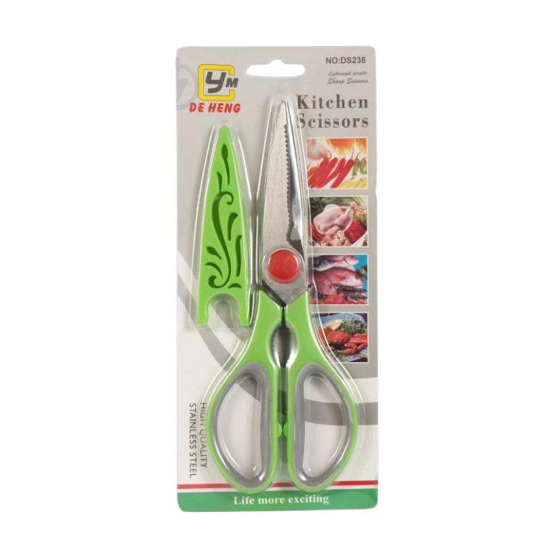 Deze multifunctionele keukenschaar met beschermhoes is een onmisbaar hulpmiddel in elke keuken. De scherpe roestvrijstalen (RVS) bladen maken het eenvoudig om vlees, kip, groenten en verpakkingen snel en veilig te knippen.