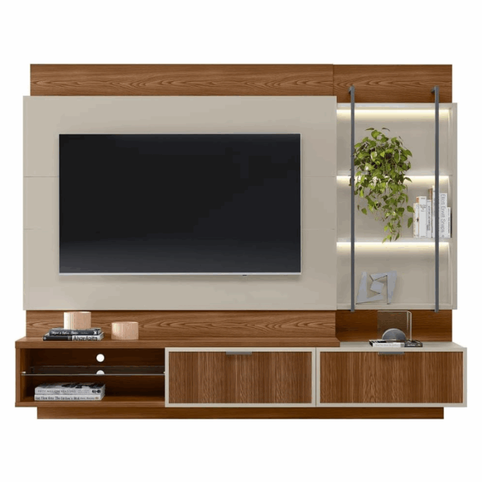 Dit wandmeubel is voorzien van meerdere open vakken en gesloten opbergruimtes, ideaal voor het overzichtelijk opbergen van media-apparatuur, boeken, accessoires of decoratie.