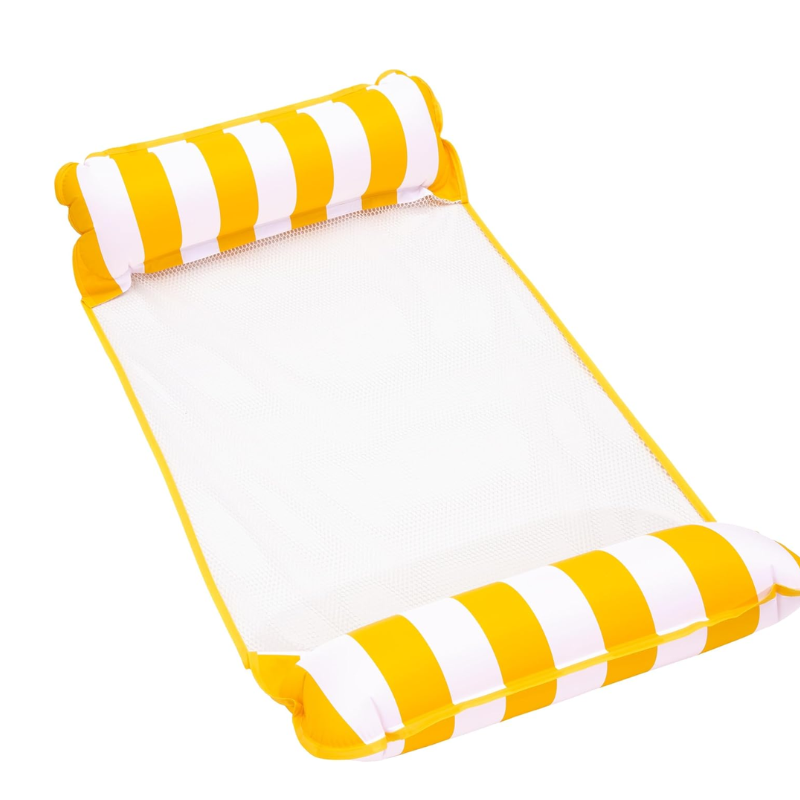 Ontspan stijlvol op het water met deze opblaasbare waterhangmat! De opblaasbare hoofd- en voetsteunen zorgen voor optimaal comfort, terwijl het zachte netmateriaal je lichaam lichtjes in het water laat zweven – perfect voor verkoeling op een warme dag.