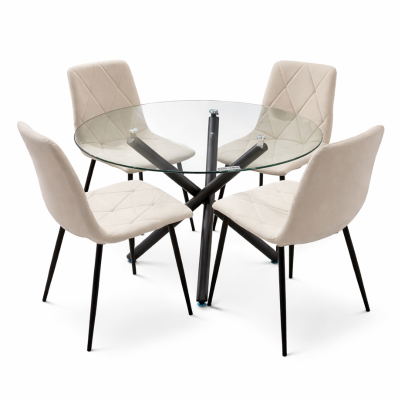 De set wordt geleverd met 4 elegante beige stoelen met zachte bekleding en een ergonomisch ontwerp. De slanke zwarte poten geven het geheel een moderne look en zorgen voor stabiliteit.