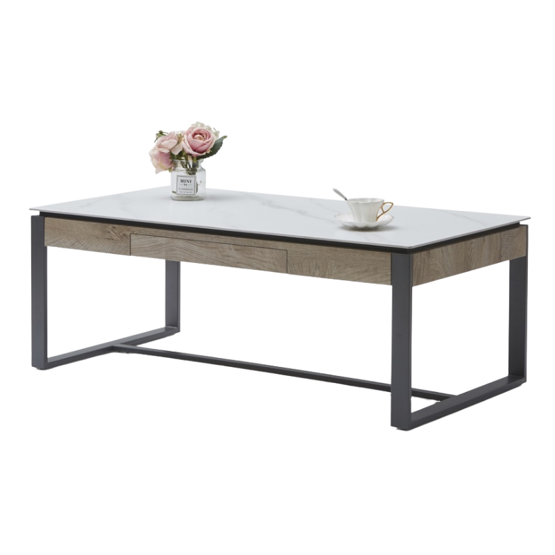 Deze moderne salontafel is een stijlvolle blikvanger voor elke woonkamer. Het witte blad met marmerlook straalt luxe uit, terwijl de lade in licht hout een warme, natuurlijke touch toevoegt. Het zwarte metalen frame zorgt voor een strak en industrieel accent. Dankzij de geïntegreerde lade is deze tafel niet alleen mooi, maar ook praktisch—perfect voor het opbergen van afstandsbedieningen, tijdschriften of kleine accessoires.